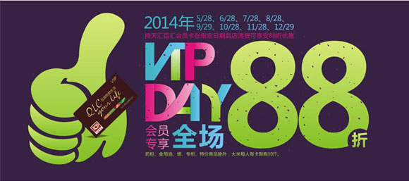 活动当天,会员专享全场88折,机会难得,赶快行动吧!(大米每人每卡限购30斤;奶粉、食用油、香烟、部分专柜、特价商品除外,此活动不能与其他优惠活动同时进行)。