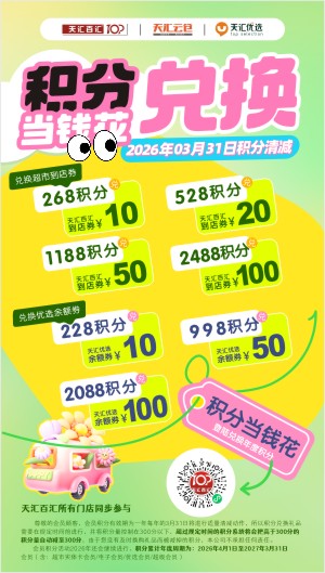 会员积分有效期为1年,每年3月31日将统一清理。 请在3月31日前完成积分兑换,将积分控制在300分以内。 逾期未兑换,系统将自动把高于300分的积分调整至300分,因未及时兑换产生的积分扣减,本店不承担责任。
