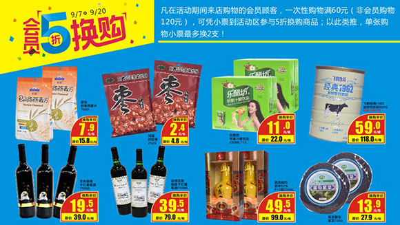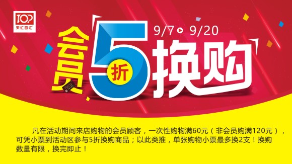 凡在活动期间来店购物的会员顾客,一次性购物满60元(非会员购满120元),可凭小票到活动区参与5折换购商品;以此类推,单张购物小票最多换2支